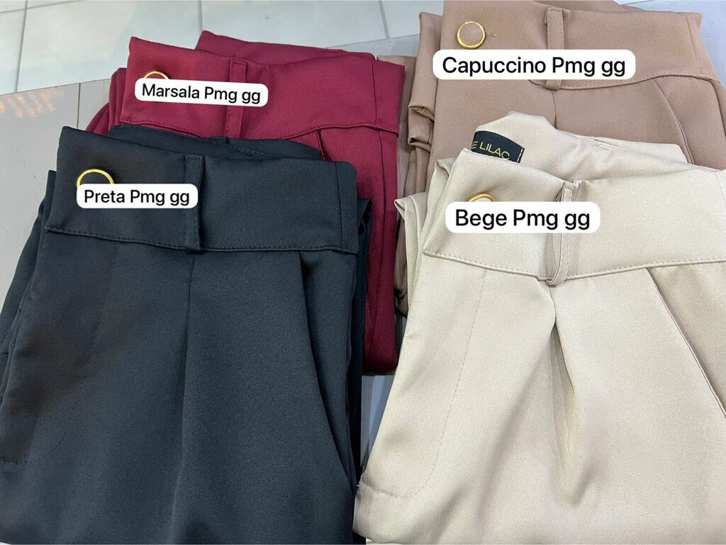 Feita no tecido crepe alfaiataria com modelagem impecável e corte reto. Cintura alta com passadores para cinto, bolsos faca discretos, fechamento por zíper e botão frontal.